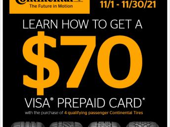 - Get a $70 VISA® prepaid card with the purchase of four (4) qualifying passenger Continental Tires between November 1, 2021 and November 30, 2021.